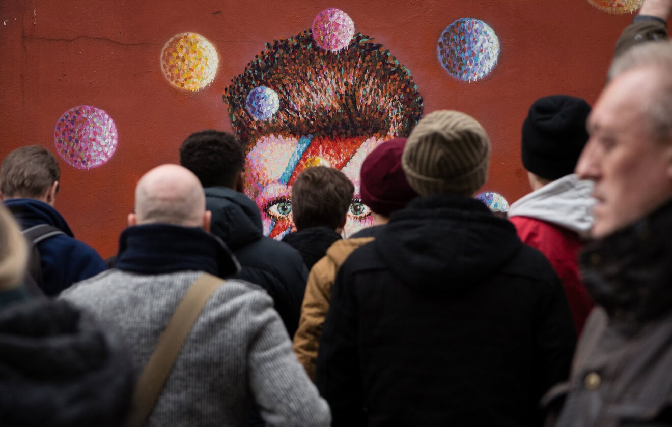 Crowd Admiring Colorful Street Art in Urban Public Space